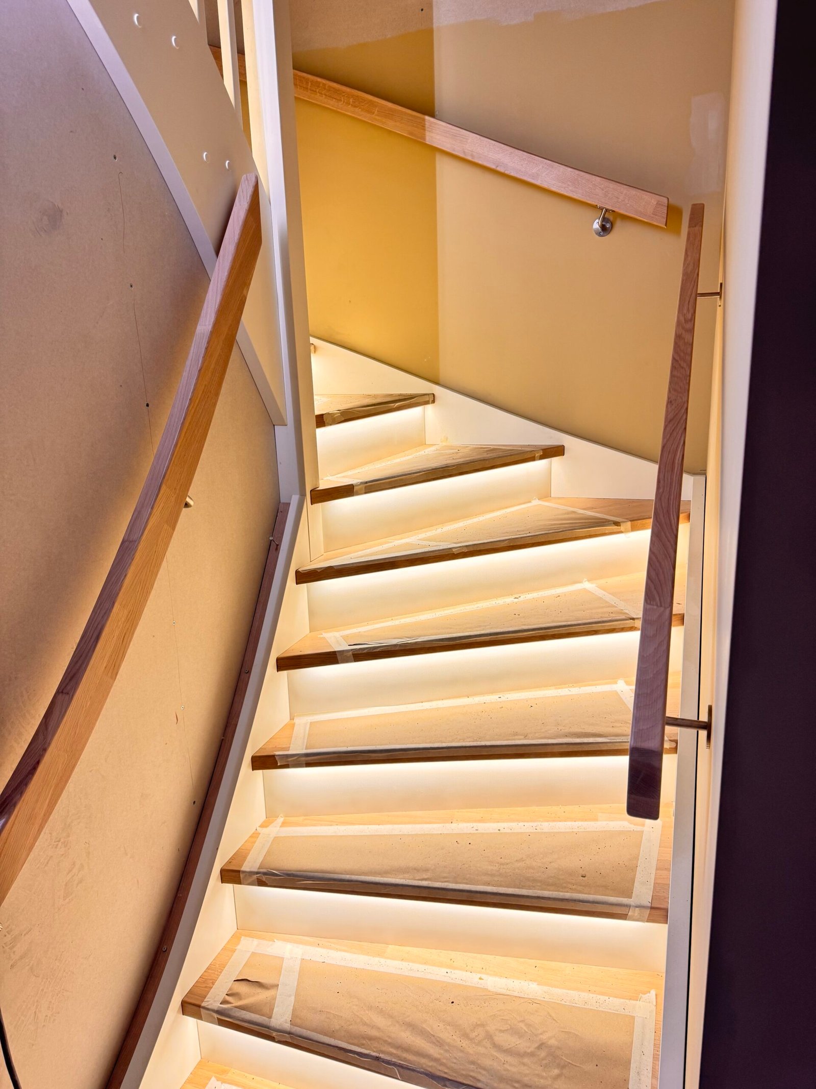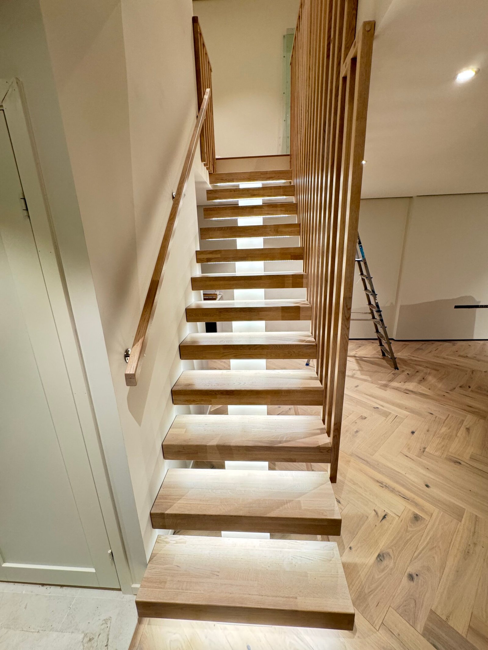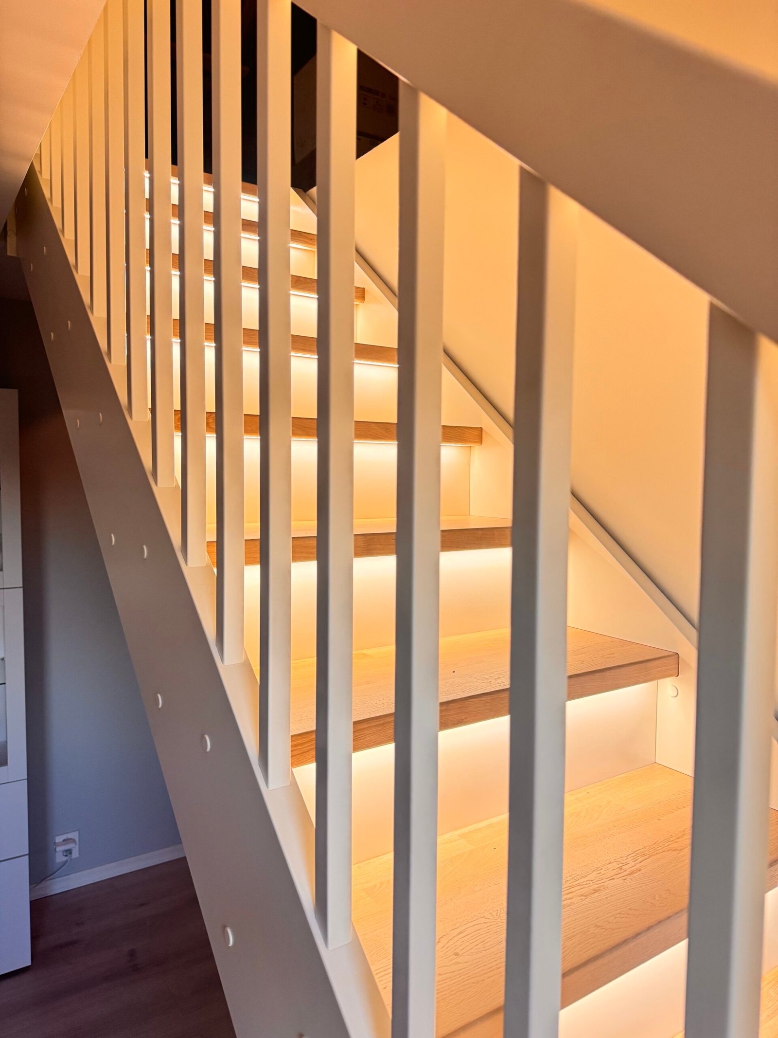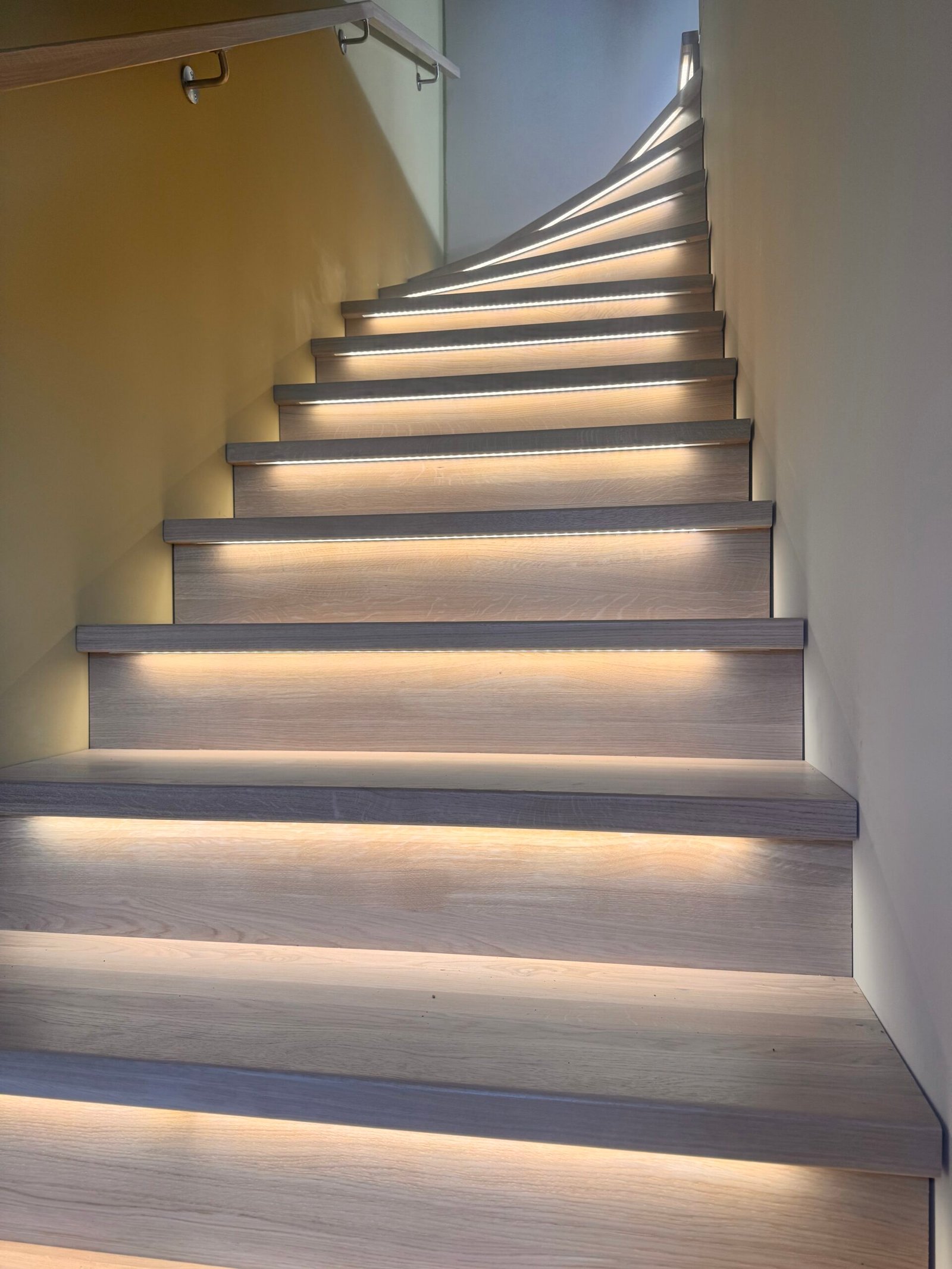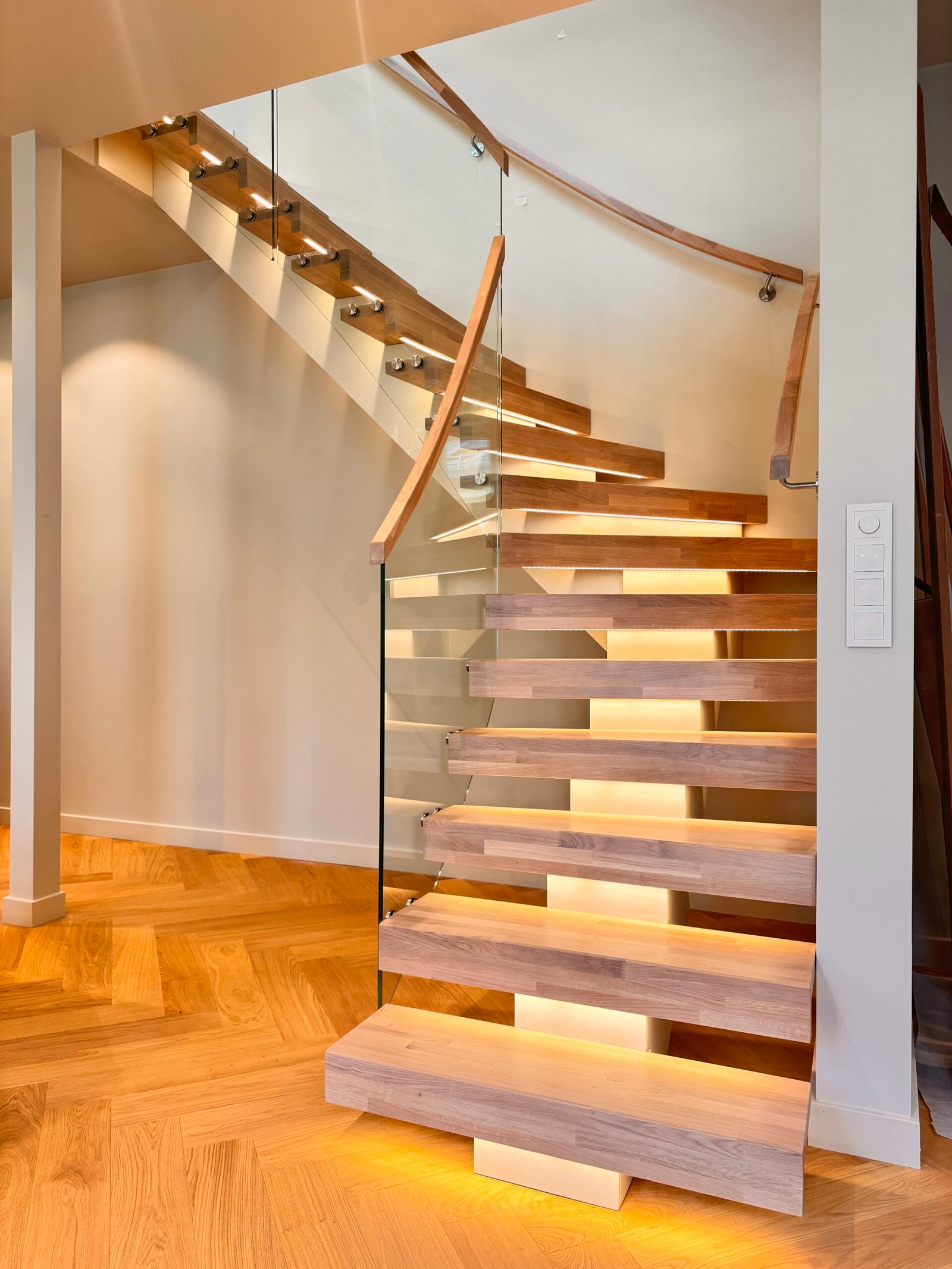 Moderne trapp med glass rekkverk og LED-lys