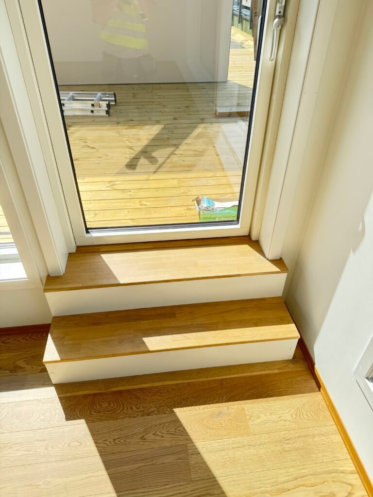 I tillegg ble det levert små trapper med to trinn, som fungerer som praktiske nivåoverganger i boligene. Disse trappene er også produsert etter mål for å passe perfekt til planløsningen.
